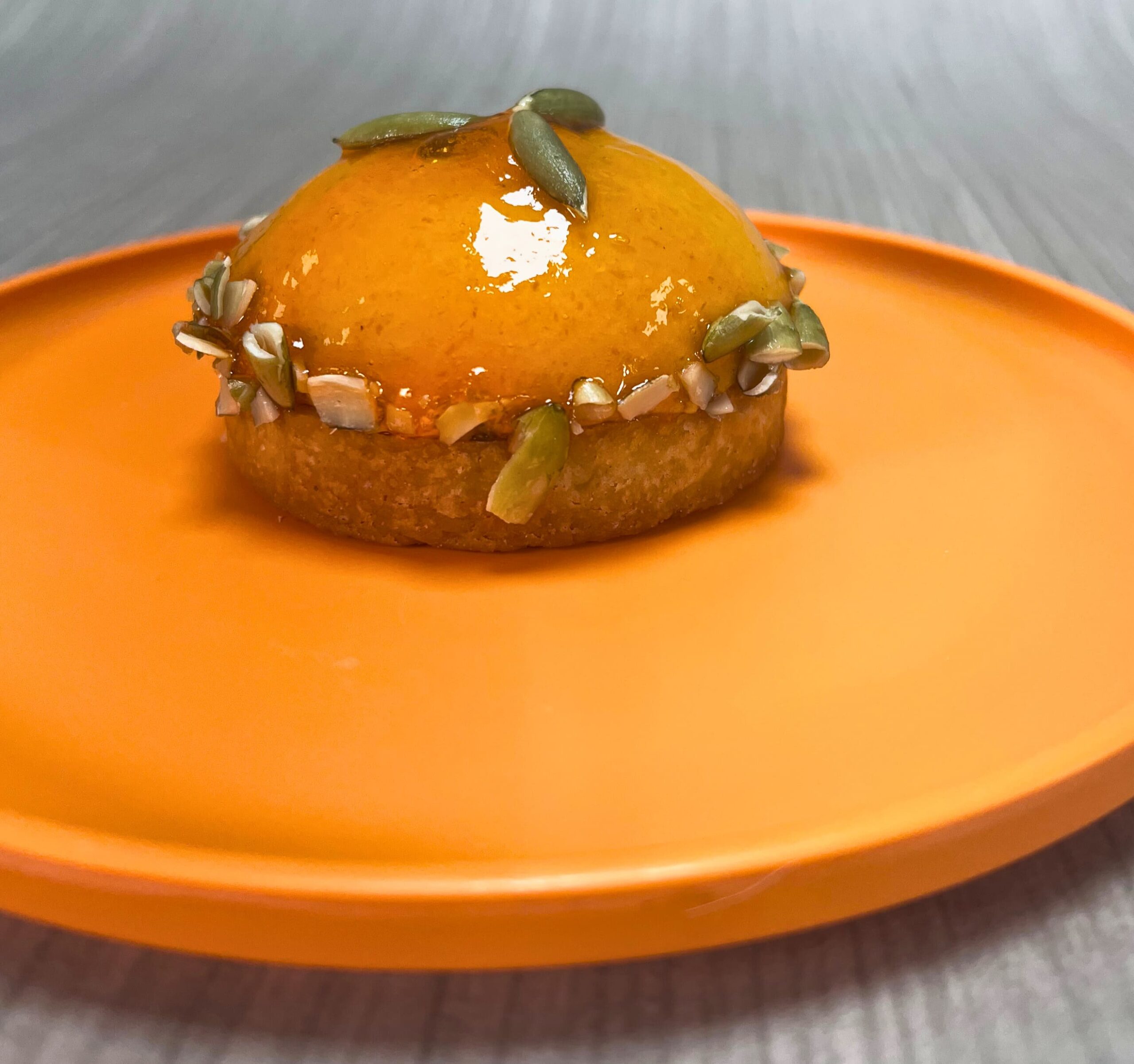 Delicada base de galleta con frangipán de almendra y naranja, coronada con un domo de