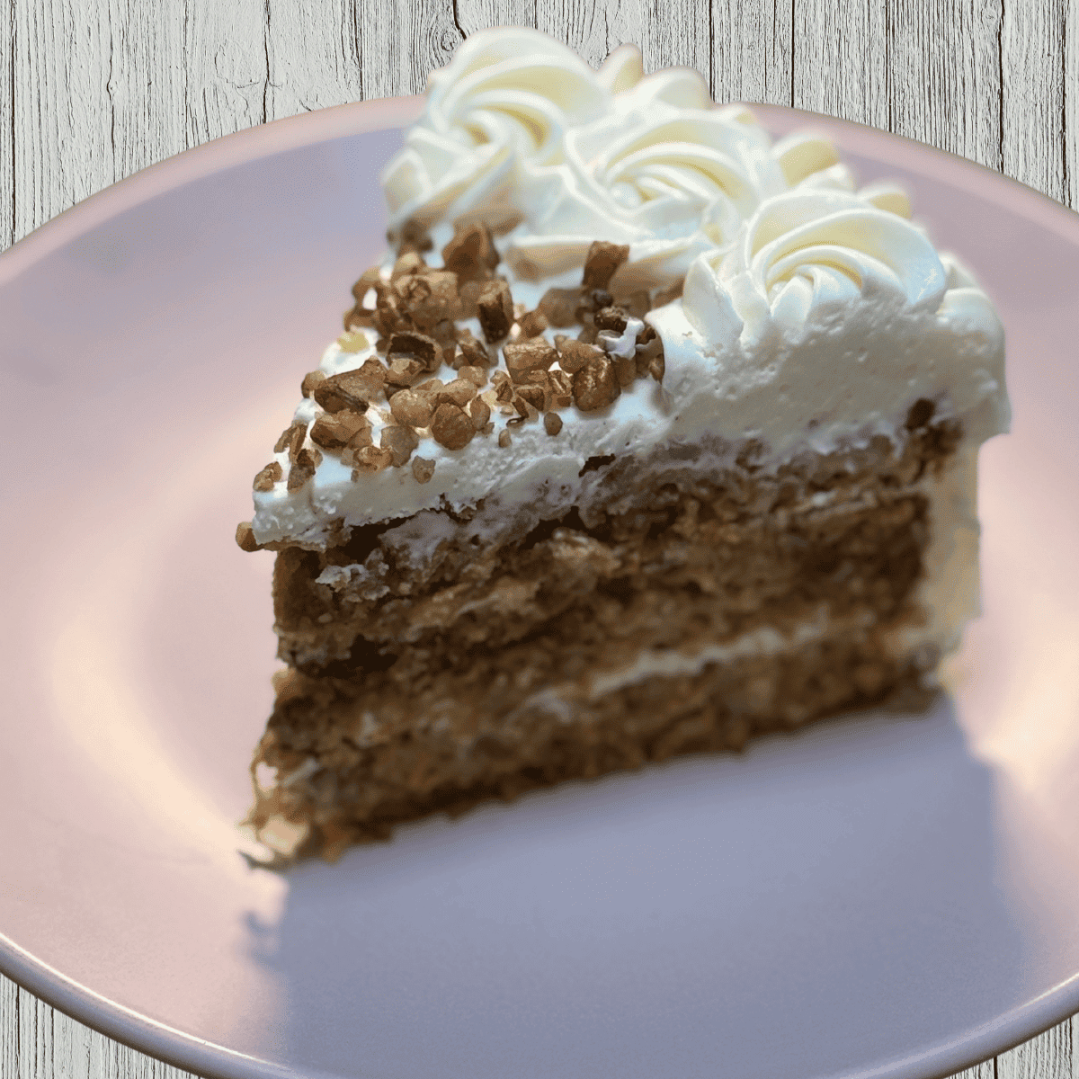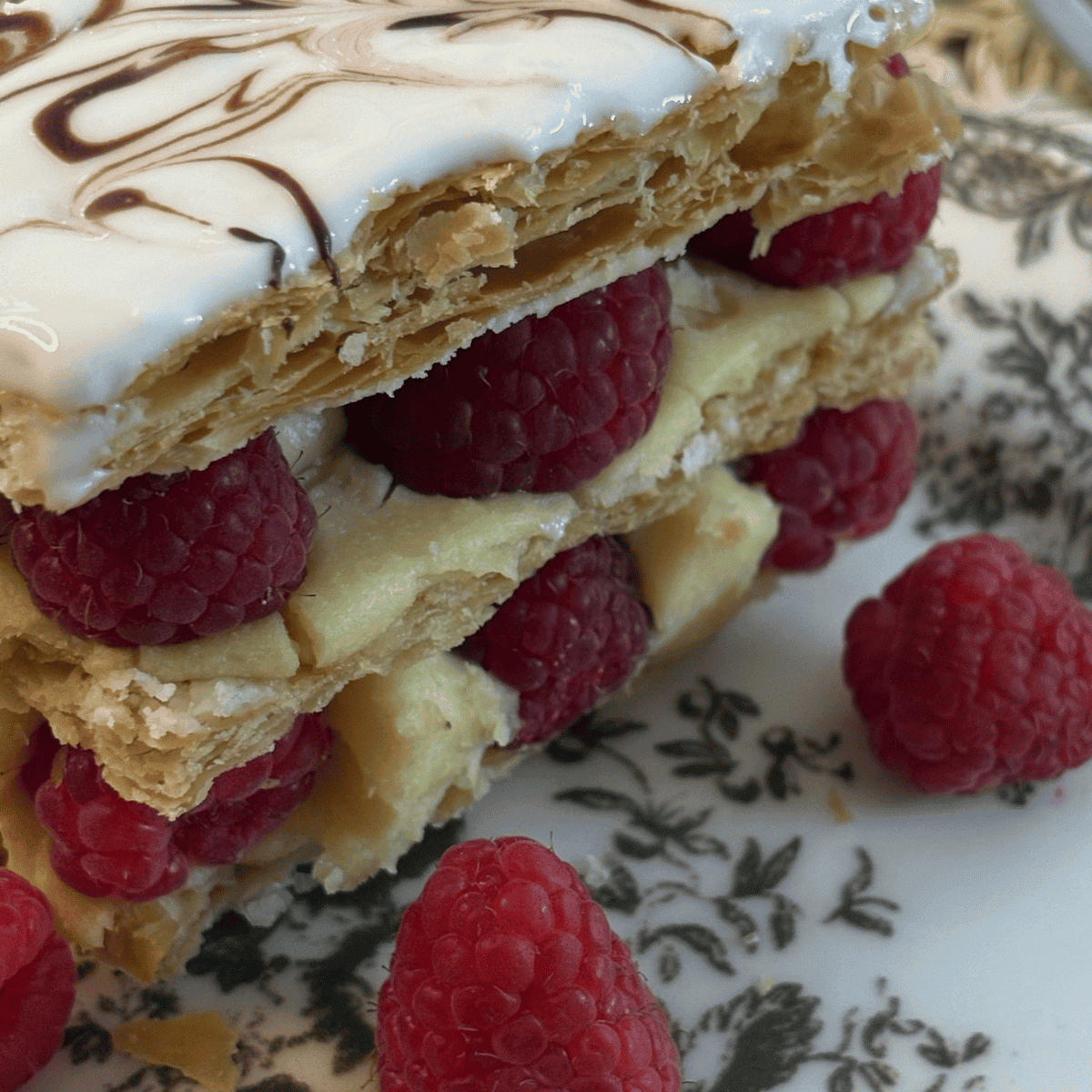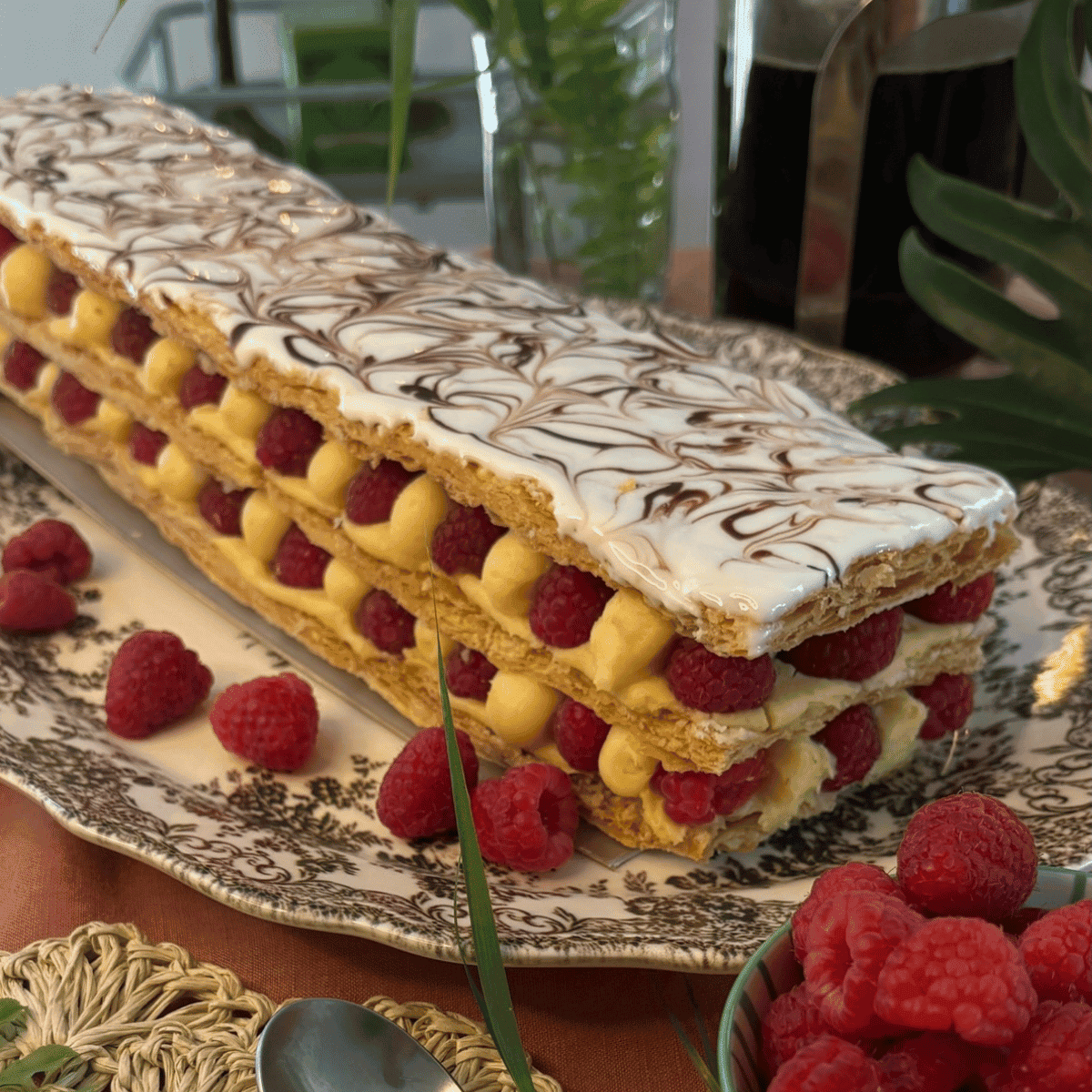 Dos capas de crujiente hojaldre relleno de crema musseline (crema pastelera con mantequilla aterciopelada) y frambuesa fresca. Ideal para días de calor y el toque acido ajusta el dulzor del fondant de la cubierta.