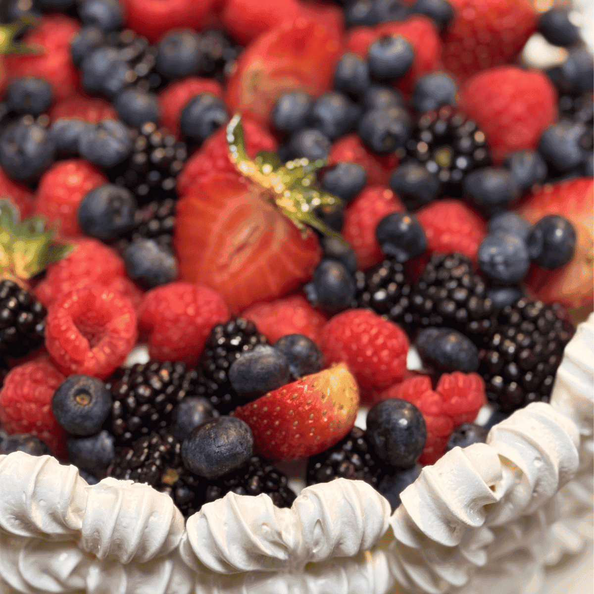 Por fuera, está cubierto con aún más merengue crujiente, creando una textura irresistible en cada bocado. Se corona con una selección de frutos rojos frescos, que no solo realzan su sabor, sino que lo convierten en un postre visualmente espectacular.