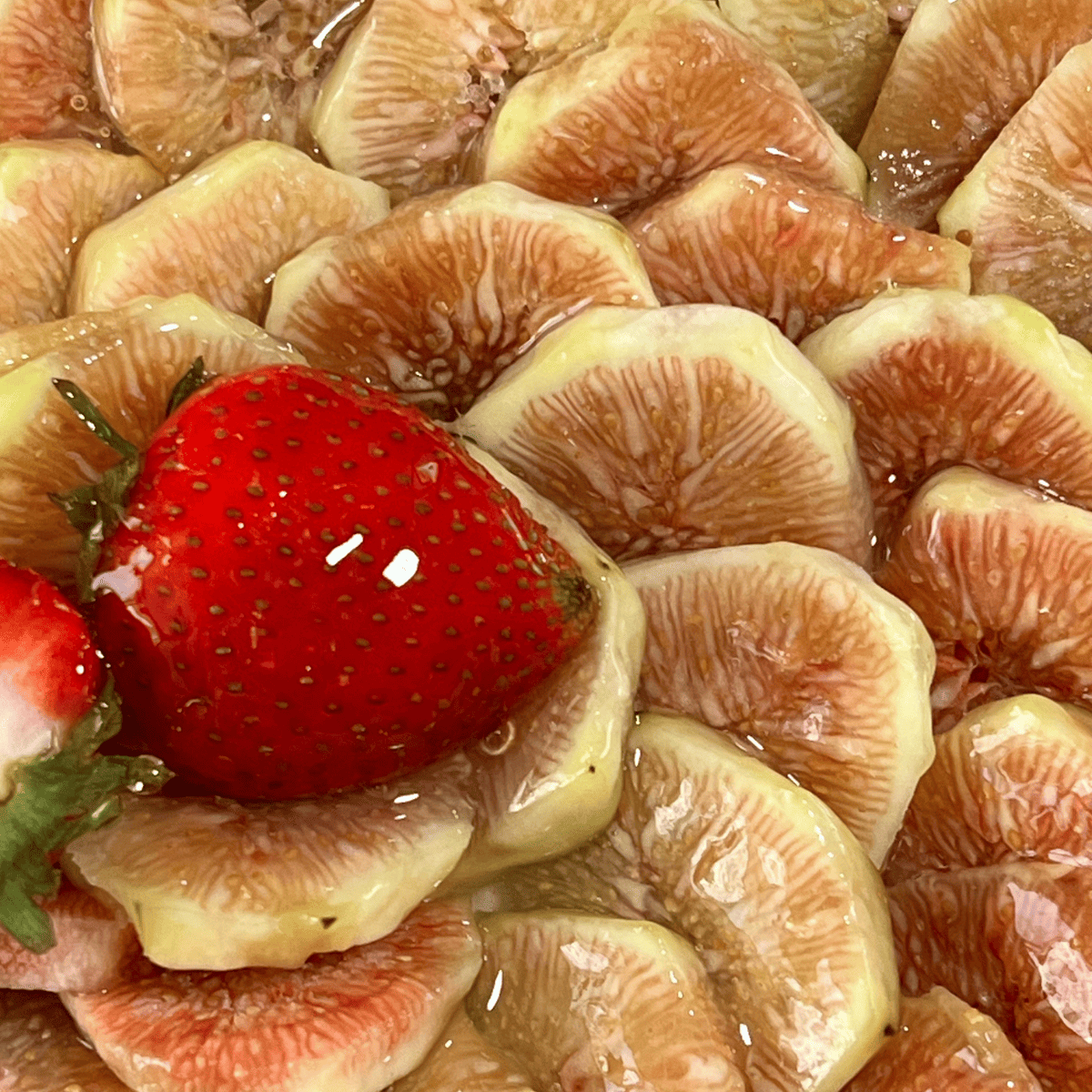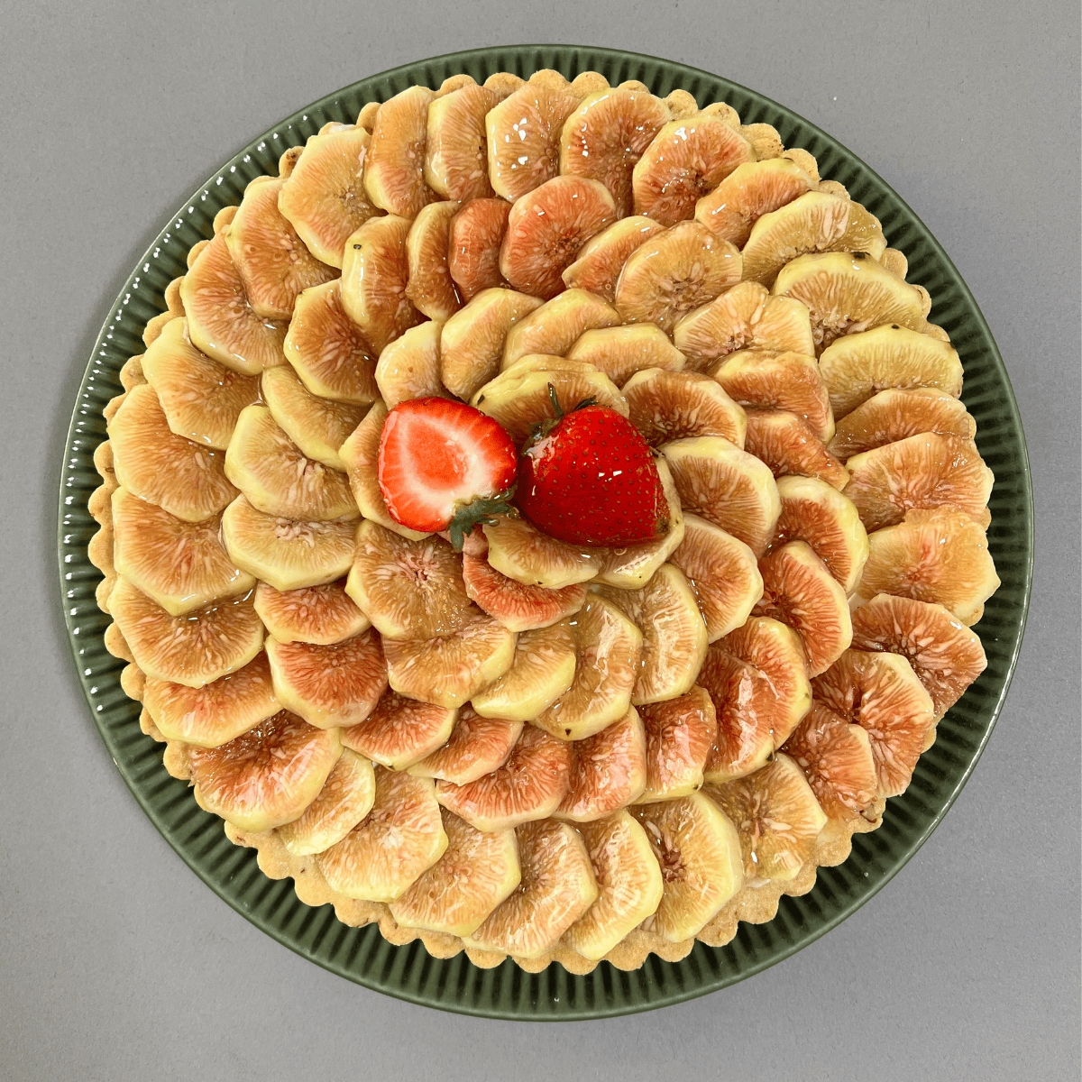 Deliciosa galleta de nuez, relleno de queso crema, cubierta de higos. Nuestra tarta más famosa.
