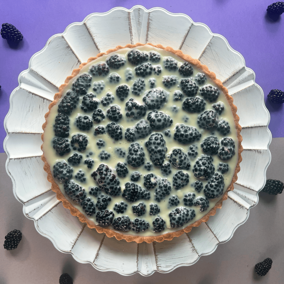 Deliciosa galleta de mantequilla, relleno de chocolate blanco y zarzamora.